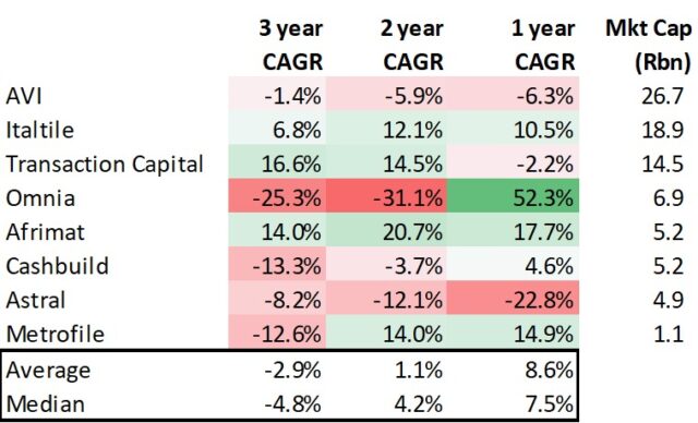 For example, Afrimat has done well. Omnia has been an incredible buy in the past 12 months (up over 50%) and terrible before that. Transaction Capital has been good over 3 years but has had a slow 12 months.